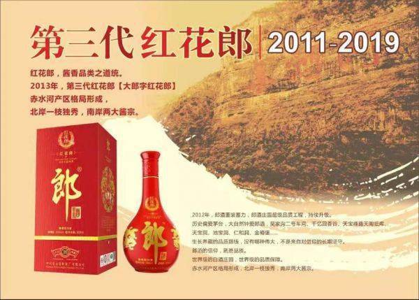 2011年,第三代红花郎去掉经典的山水画,突出大“郎”字标识,采用红花郎粱麦版LOGO,造型更加大气简洁。同时,瓶型稍作调整,线条更加柔和流畅,光泽度更加亮丽,中国红越发纯正,更显精致华贵。
