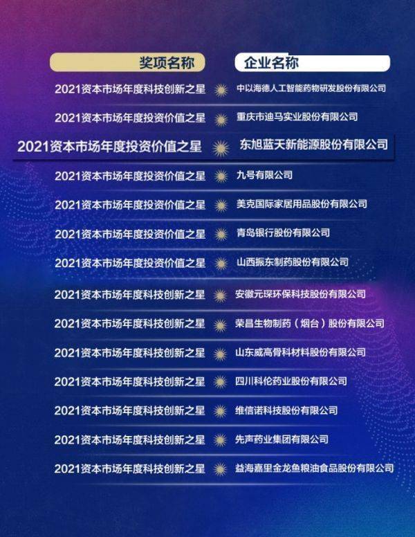 国内A股主板上市公司东旭蓝天新能源股份有限公司(以下简称:东旭蓝天)凭借投资价值、稳健发展、创新管理等多个维度的良好成绩,从众多参选企业中脱颖而出,荣获“2021资本市场年度投资价值之星”奖项。