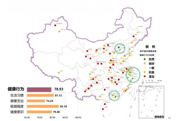 全国各城市间健康行为水平极化现象突出。所有评价城市中,仅2.2%的城市处于优秀水平,而61.1%的城市属于一般及以下水平。从区域角度来看,长三角、珠三角、京津冀城市群内主要城市健康行为水平较高;此外东部一般地级市表现也十分优异,特别是浙江省形成了健康行为的高地。从健康行为下辖的四个二级指标来看,控烟程度的贡献度最高,健康支出平均分较低,拉低了健康行为指数的整体表现。