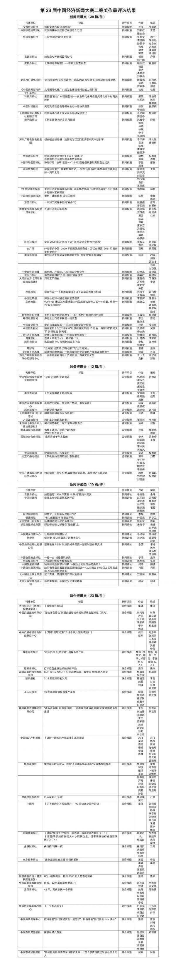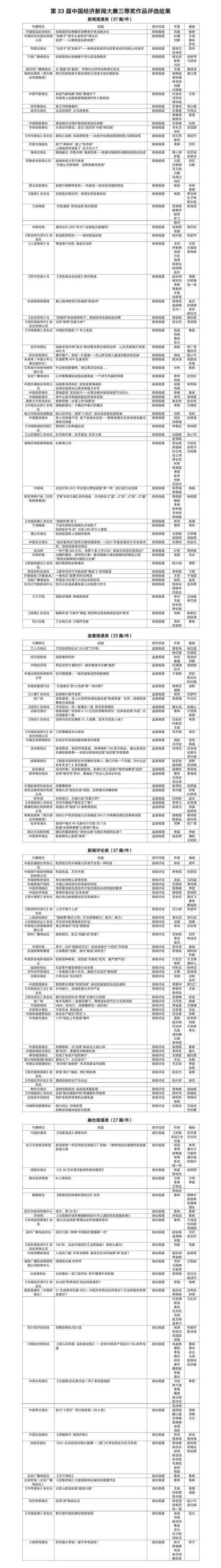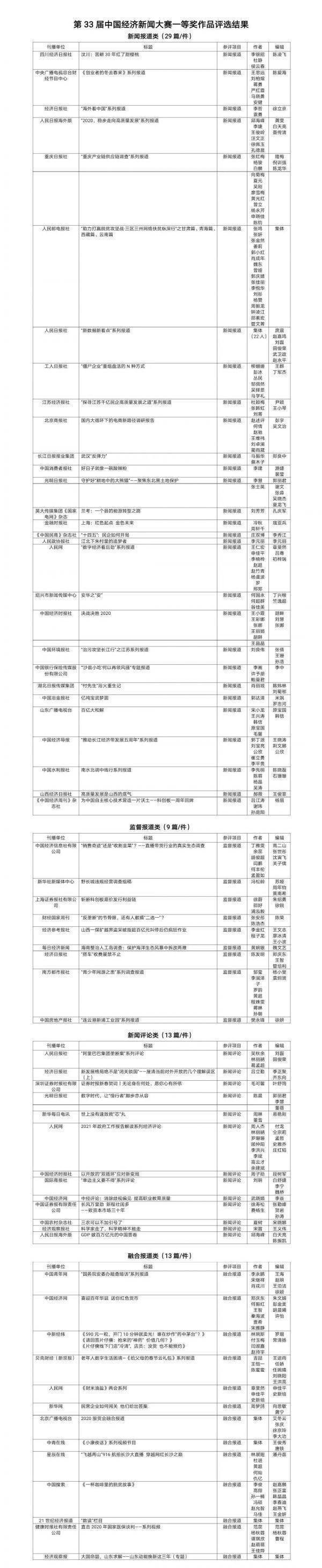 据悉,全国226家媒体(包括全国经济类报纸和新媒体132家、中央和地方党报26家、广播电视台18家、经济类刊物50家)共推荐了962件作品参评第33届中国经济新闻奖。经过初评、复评、定评及公示,有300件作品获奖,其中特别奖2件,一等奖64件,二等奖88件,三等奖146件。