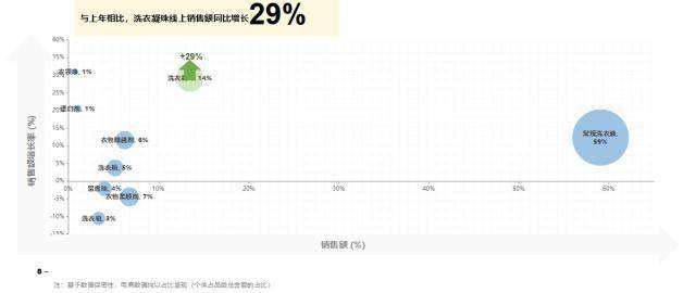 在持续增长的衣物清洁市场中,洗衣凝珠增速显著,洗衣凝珠线上销售额同比增长超29%,市场规模仅次于常规洗衣液。目前,洗衣凝珠品类中高端市场仍占据主导地位,而随着消费者环保观念的不断增强,洗衣凝珠市场需求持续提升,大众市场品牌以80%的增速扩大市场份额。
