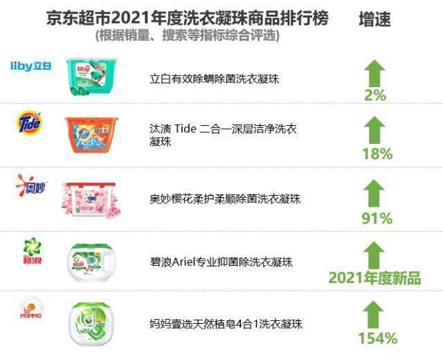 众多洗衣凝珠品牌中,国产品牌占据领先地位。京东超市2021年度洗衣凝珠商品排行榜中,国产品牌立白除菌洗衣凝珠为最热销产品,同为国产品牌的妈妈壹选天然值皂4合1洗衣凝珠,同样成功上榜,同比增速更达到154%。从榜单商品来看,“除螨抑菌”成为热销产品关键词。