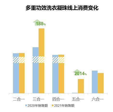 而随着消费者需求日益多元化,具备多重功效的洗衣凝珠更受青睐。通过多腔体包装技术,进一步实现了洗衣凝珠功效升级。数据显示,2021年三效合一洗衣凝珠占据主要市场份额,2021年销售额同比增长达188%,五效合一洗衣凝珠增长20倍。