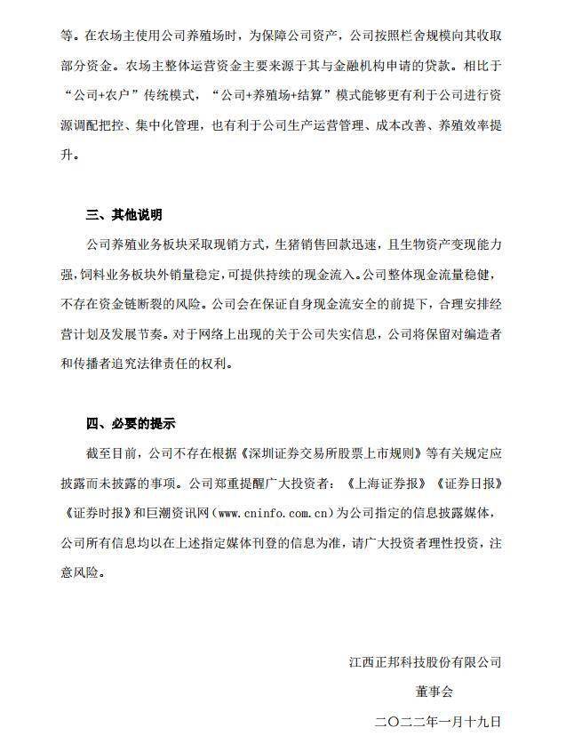 金融界1月18日消息 正邦科技澄清公告,正邦科技表示农场主整体运营资金主要来源于其与金融机构申请的贷款。相比于“公司+农户”传统模式,“公司+养殖场+结算”模式能够更有利于公司进行资源调配把控、集中化管理,也有利于公司生产运营管理、成本改善、养殖效率提升。公司养殖业务板块采取现销方式,生猪销售回款迅速,且生物资产变现能力强,饲料业务板块外销量稳定,可提供持续的现金流入。公司整体现金流量稳健,不存在资金链断裂的风险。