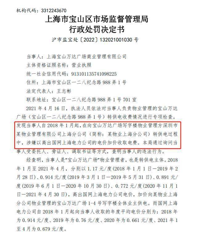 天眼查App显示,近日,上海宝山万达广场商业管理有限公司因电力价格违法行为被宝山区市场监督管理局罚款约27.45万元。具体事由为,当事人宝山万达公司在向写字楼物业管理方某物业上海分公司转供电过程中,涉嫌以高出国网上海电力公司的电价加价收取电费。