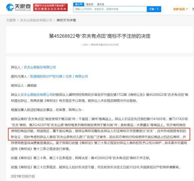 天眼查App显示,近日,第45268822号“农夫有点田”商标不予注册的决定文书公开。