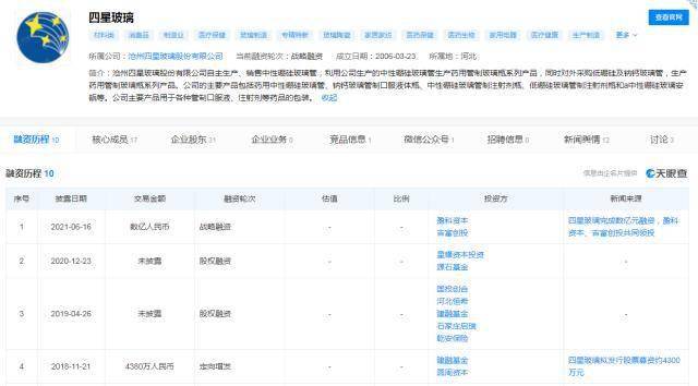 天眼查信息显示,四星玻璃曾有过多伦融资,最近一轮是在2021年6月,战略融资金额数亿元人民币,投资方为盈科资本、吉富创投。