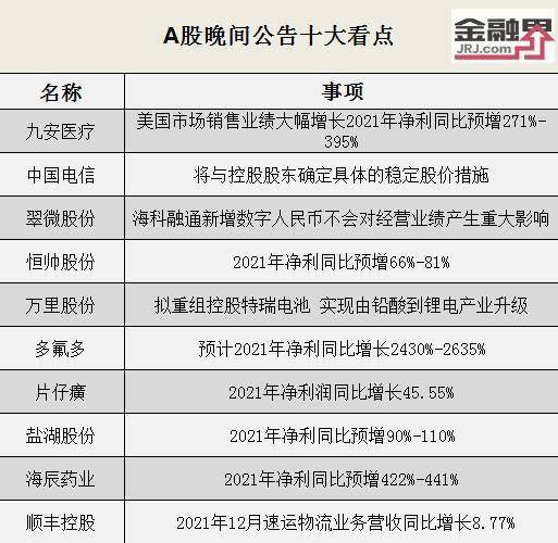 金融界1月19日消息 今日晚间重要公告抢先看——九安医疗2021年净利同比预增271%-395%、中国电信将与控股股东确定具体的稳定股价措施、万里股份拟重组控股特瑞电池 实现由铅酸到锂电产业升级……