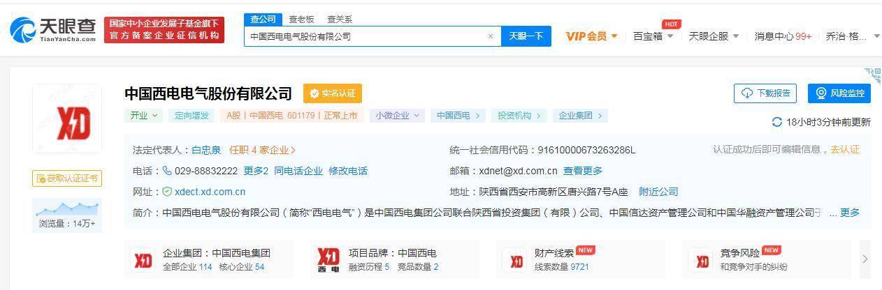 据天眼查显示,中国西电电气股份有限公司(简称“西电电气”)是中国西电集团公司联合陕西省投资集团(有限)公司、中国信达资产管理公司和中国华融资产管理公司于2008年4月以发起设立方式设立的股份有限公司。