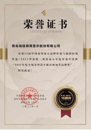 近日,2021华显奖盛典在深圳召开。凭借持续不断的产品和技术创新,海信商用显示公司荣获“2021年度全场景智慧平板市场知名品牌奖”,这也是海信连续第二年获得这项被称为商用显示行业“诺贝尔奖”的荣誉。