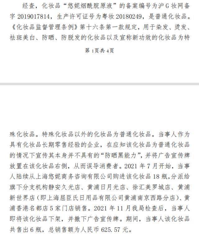 天眼查App显示,近日,上海屈臣氏日用品有限公司因虚假宣传,被上海市黄浦区市场监督管理局罚款6540元。具体情形为,当事人明知其所售“悠妮烟酰脘原液”为普通化妆品,仍宣传其本身并不具有的“防晒黑能力”,并将广告宣传牌放置在该化妆品右侧,从而误导消费者。