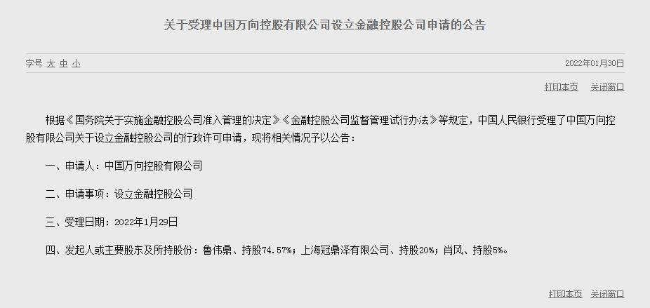 原标题:央行受理中国万向控股有限公司设立金融控股公司的申请