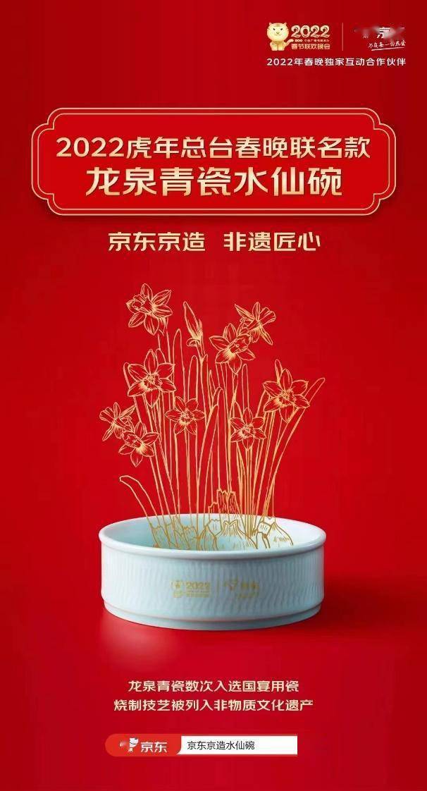 时值2022年春节,京东成为2022年中央广播电视总台春晚独家互动合作伙伴,京东京造与金宏瓷业合作研发的龙泉青瓷水仙碗也作为2022虎年总台春晚联名款惊艳大众,其背后的故事更引发广泛关注。这是京东京造联合龙泉青瓷,共同推动非遗文化传承和创新、促进实体经济高质量发展的精彩案例,更是京东京造为中小企业深度赋能的绝佳诠释。