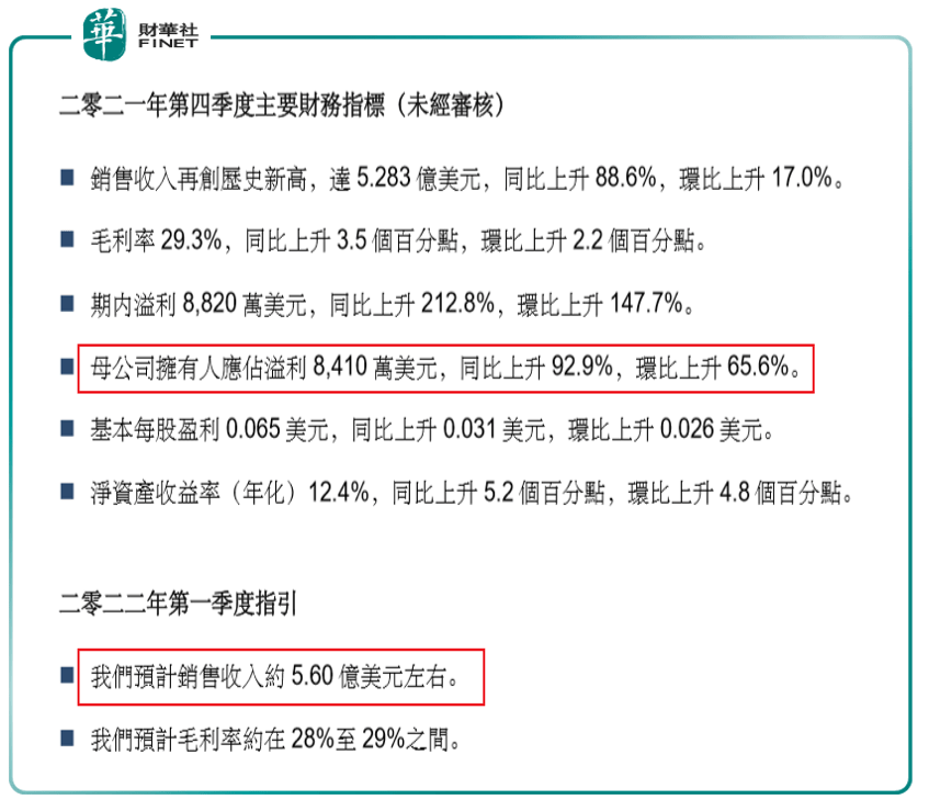 “华虹半导体第四季度业绩表现极其亮眼:销售收入再次创下历史新高,达到5.283亿美元,同比增长88.6%,环比增长17.0%,连续六个季度刷新纪录;净利润、年化净资产收益率也双双创下历史新高;毛利率持续稳中有升,达到29.3%,同比上升3.5个百分点,环比上升2.2个百分点,其中八英寸厂的毛利率首次达到了40.0%。如此优异的成就,为2021年画上了一个具有里程碑意义的圆满句点。”