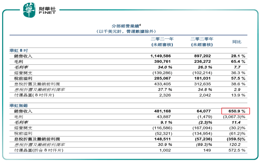 无锡12英寸生产线被市场给予了极大期望,而本季度业绩也确实表现不俗。以分部经营业绩来看,华虹无锡本季度销售收入同比增长650.9%,销售收入4.812亿美元。