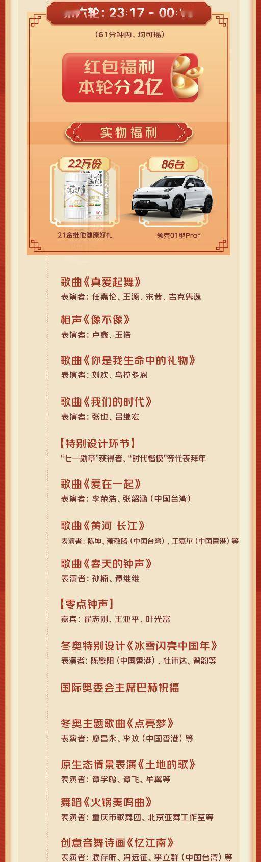 在春晚直播期间的互动活动中,将共送出131台汽车(“汽车”指汽车指定期限的使用权),其中包括东风公司岚图FREE、领克01型Pro,将分别在第四轮、第六轮摇出。此外,2022虎年总台春晚联名款·金碗套装,以及小米手机、电视等新春好礼,将在第三轮的时候摇出。还有超一万瓶梦之蓝M6+、养生堂天然维生素C、Pico Neo3 VR一体机等诸多好礼,都将在这七轮互动活动中陆续摇出。