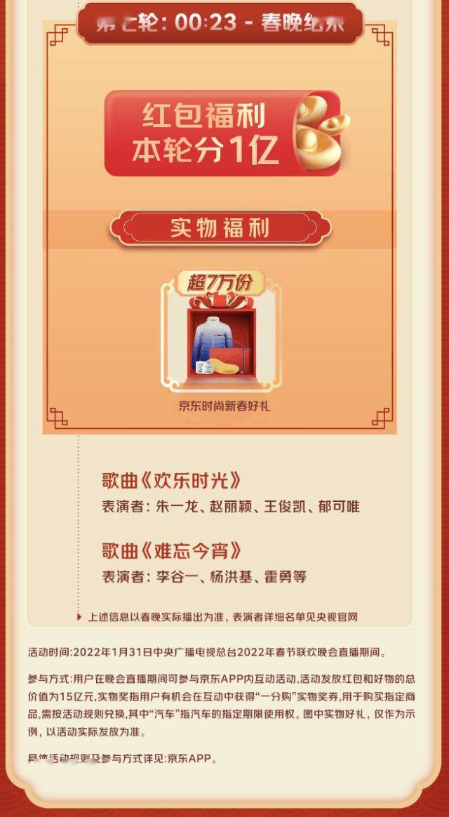 就在今晚央视春晚直播期间,京东也将邀请全民分15亿红包和好物,共在春晚直播期间分七轮摇出。除了红包,还有包括131台汽车、超5000台手机及电视、2022虎年总台春晚联名款·金碗套装、超3万份中国移动新春好礼、超7万份京东时尚新春好礼在内的实物好礼。