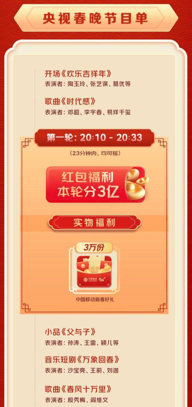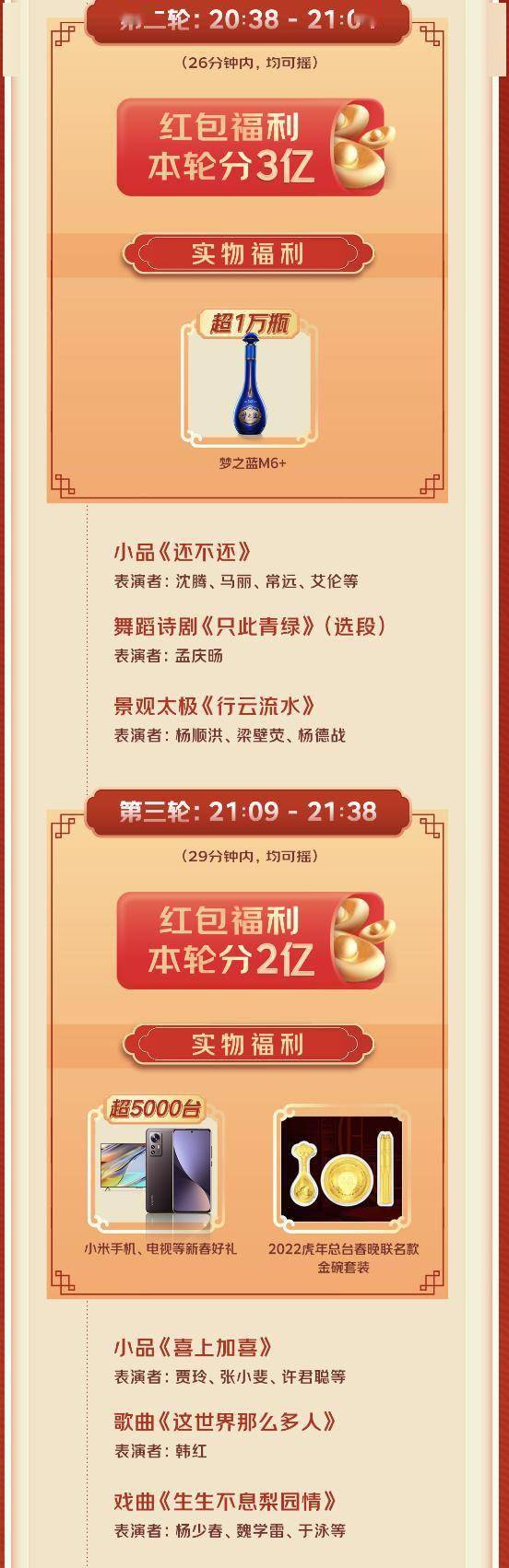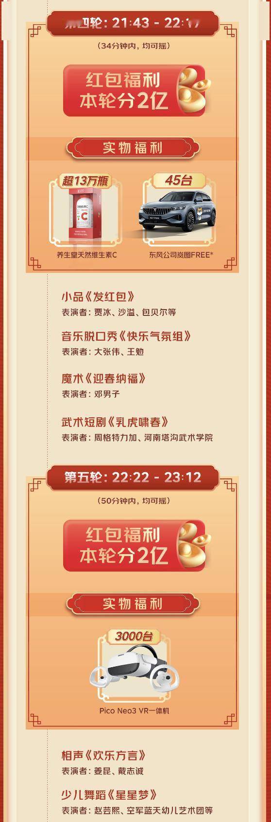 在七轮的红包和好物中,第一轮、第二轮将分总价值3亿的福利,持续时间分别从20:10-20:33、20:38-21:04;从第三轮到第六轮各分2亿福利,时间分别为21:09-21:38、21:43-22:17、22:22-23:12、23:17-00:18;最后一轮则在00:23开始,持续至春晚结束,该轮将分1亿福利。