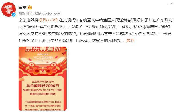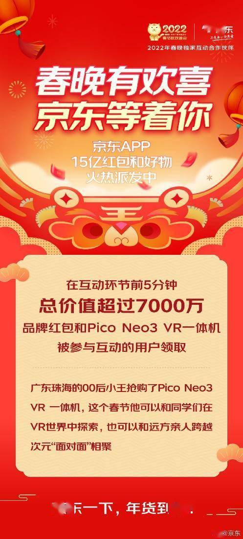 盼望着,盼望着,虎年春晚终于如约而至。作为总台2022年春晚独家互动合作伙伴,京东携手Pico带来海量新春好礼,向全国人民拜年啦。在春晚互动环节,全国消费者更是热情高涨,数据显示,前5分钟总价值超过7000万的品牌红包和Pico Neo3 VR一体机便被用户领取,抢购气氛瞬间达到高潮。