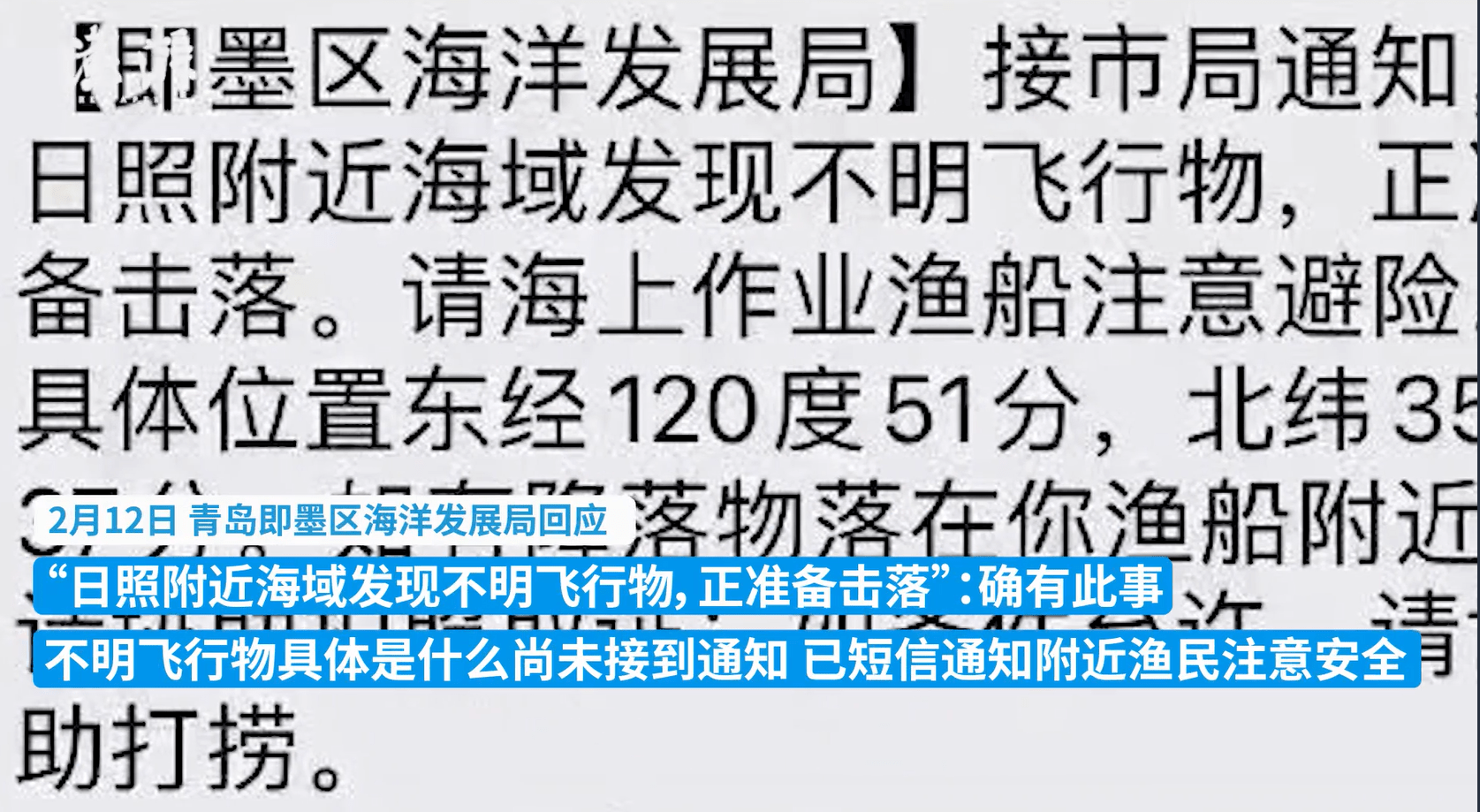 NO.1 2月12日,网传山东青岛即墨区海洋发展局发通知称,日照附近海域发现不明飞行物,正准备击落。这份通知中还提到,如有降落物落在渔船附近,请协助拍照取证;如条件允许,请协助打捞。据澎湃新闻,青岛即墨区海洋发展局回应:确有此事,不明飞行物具体是什么尚未接到通知,已短信通知附近渔民注意安全。