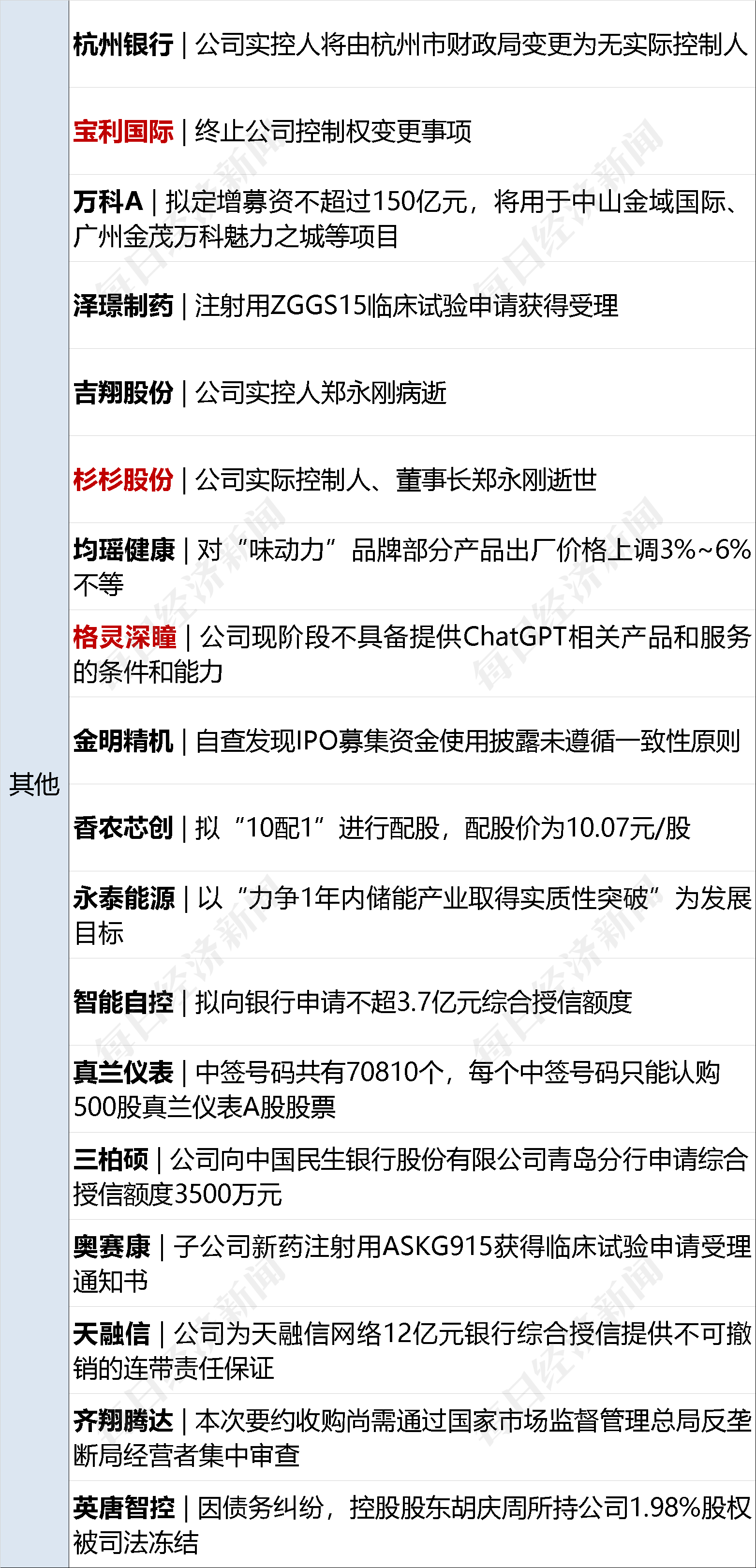 NO.1 万科A(SZ000002,股价17.67元,市值2055亿元):2月12日晚,万科A披露2023年度非公开发行A股股票预案,拟募资不超150亿元,用于中山金域国际、广州金茂万科魅力之城等11个项目以及补充流动资金。本次发行数量将不超过11亿股,占目前万科总股本的9.46%。万科方面向《每日经济新闻》记者表示,本次非公开发行的目的,一方面是响应国家政策号召;另一方面,公司拟通过本次非公开发行,优化自身资本结构。