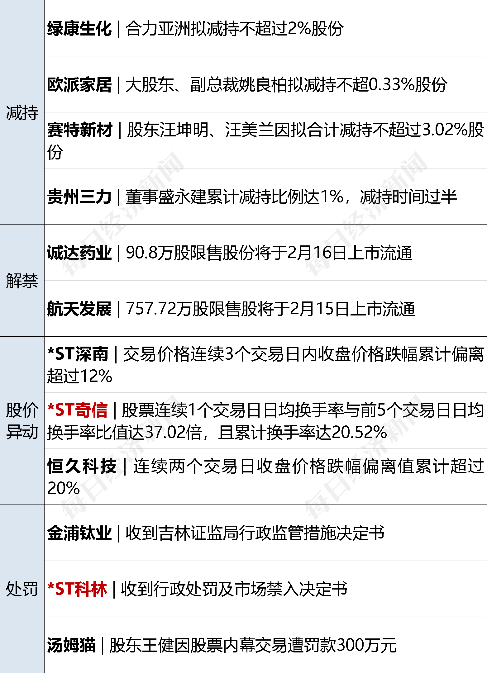 NO.6 汤姆猫(SZ300459,股价3.68元,市值129亿元):2月12日,汤姆猫公告,公司股东王健近日收到由浙江证监局下发的《行政处罚决定书》,因涉嫌股票内幕交易被处以300万元罚款。而王健内幕交易“金科文化(证券简称后变更为汤姆猫)”共亏损230.45万元。汤姆猫公告称,行政处罚涉及王健个人,公司的日常经营、业务、财务状况正常。公开资料显示,王健1988年出生,曾任汤姆猫公司的董事长、总经理、财务总监等职务,还是公司重要股东,在多次减持后,最新仍持股占比超8%,是公司第三大股东。