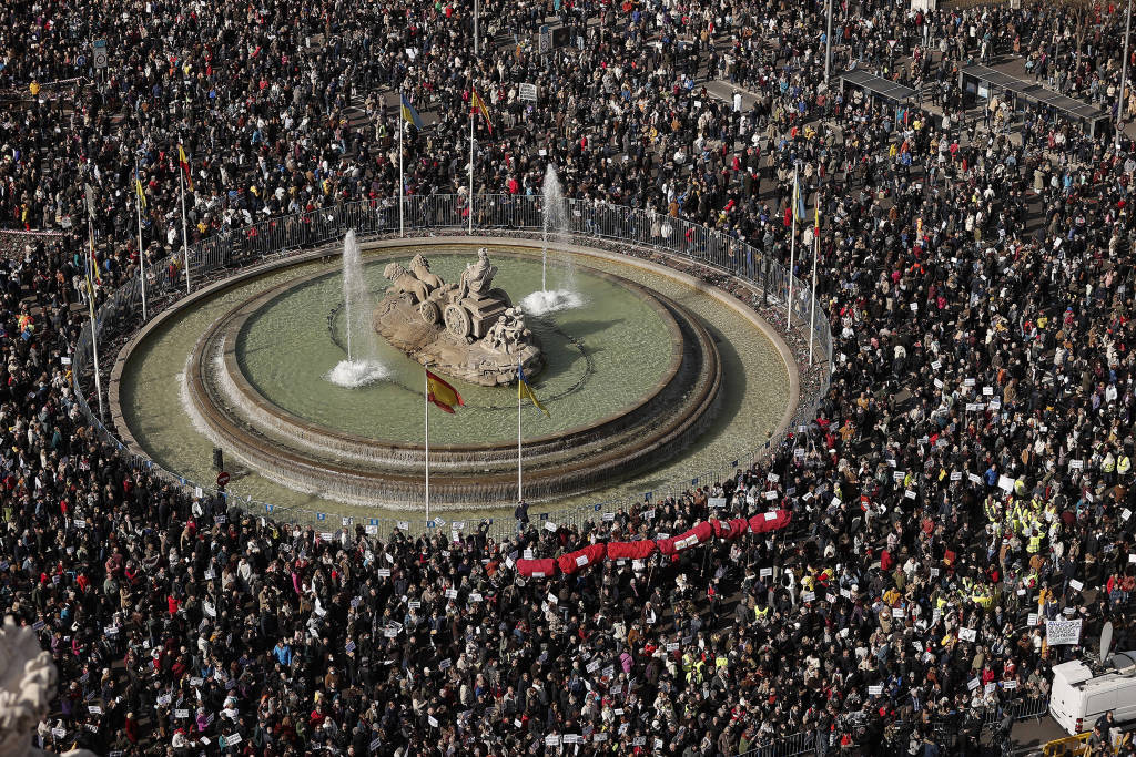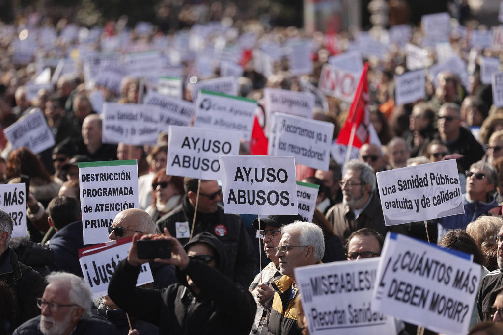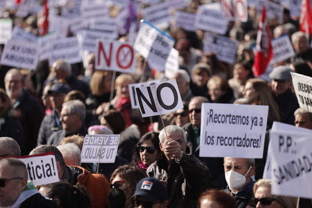当地时间2023年2月12日,西班牙马德里,当地居民和卫生工作者举行大规模游行示威活动,要求改善公共卫生系统。