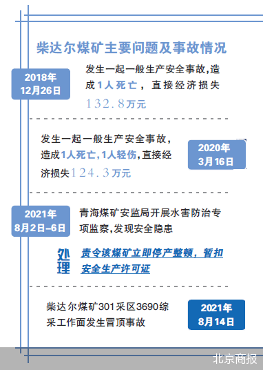 除了上述事故,去年3月16日11时50分许,柴达尔煤矿再次发生一起一般生产安全事故,造成1人死亡,1人轻伤,直接经济损失124.3万元。事后,包括西海煤炭公司董事长祁某某在内的21名相关责任人被处理。