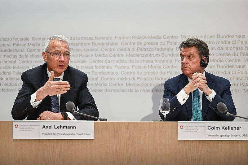 当地时间2023年3月19日,瑞士伯尔尼省,瑞信董事长莱曼(左)与瑞银董事长凯勒尔一起参加新闻发布会。图/视觉中国