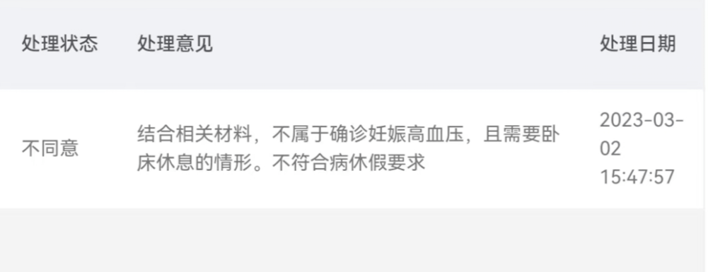 丁女士通过网络群组与人力联系,发送的信息都是“已读不回”状态。3月2日下午,人力通过oa系统回复:结合相关材料,不属于确诊妊娠高血压,且需要卧床休息的情形,驳回病假。