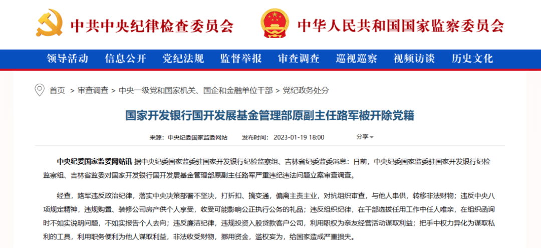 2022年7月,路军涉嫌严重违纪违法,接受纪律审查和监察调查。今年1月,路军被开除党籍。彼时通报指出,路军偏离主责主业,违规购置、装修公司房产供个人享受,违规投资入股贷款客户公司,利用职权为亲友经营活动谋取利益;把手中权力异化为谋取私利的工具,利用职务便利为他人谋取利益,非法收受财物,挪用资金,滥权妄为,给国家造成严重损失。