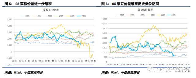 值得关注的是,随着05菜豆价差跌至600多的历史低位区间,市场基于反替代逻辑试图抄底该价差的也有所增多。但根据我们对三大油脂间价差运行驱动的了解,因替代使用场景及数量的限制,三大油脂间价差运行的趋势更多基于供应端而非需求端,这也是近几年油脂间极端价差频频出现的重要原因(2021-2022年极端高的菜豆价差源自菜油进口供应严重不足,2022年极端低的豆棕价差则因产地棕榈油出口问题)。而通过产业的反馈我们也得知,菜油相较其他植物油价差的大幅走低并未引发相应反替代的出现,且当前产业并无重新修改配方的意愿,这也暗示着食品类配方一旦修改,要想重新调回来并非像饲料配方修改那般容易。