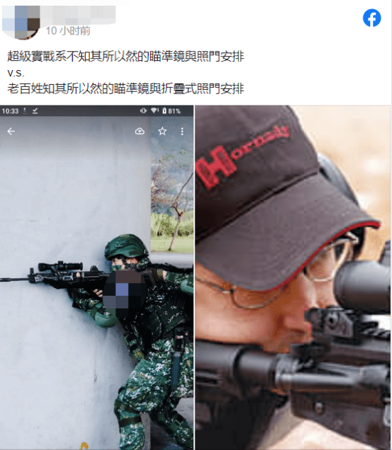 ▲有岛内网友在脸书发布“超级实战系不知其所以然的瞄准镜与照门VS老百姓知其所以然的瞄准镜与照门”安装对比图。图自中时新闻网