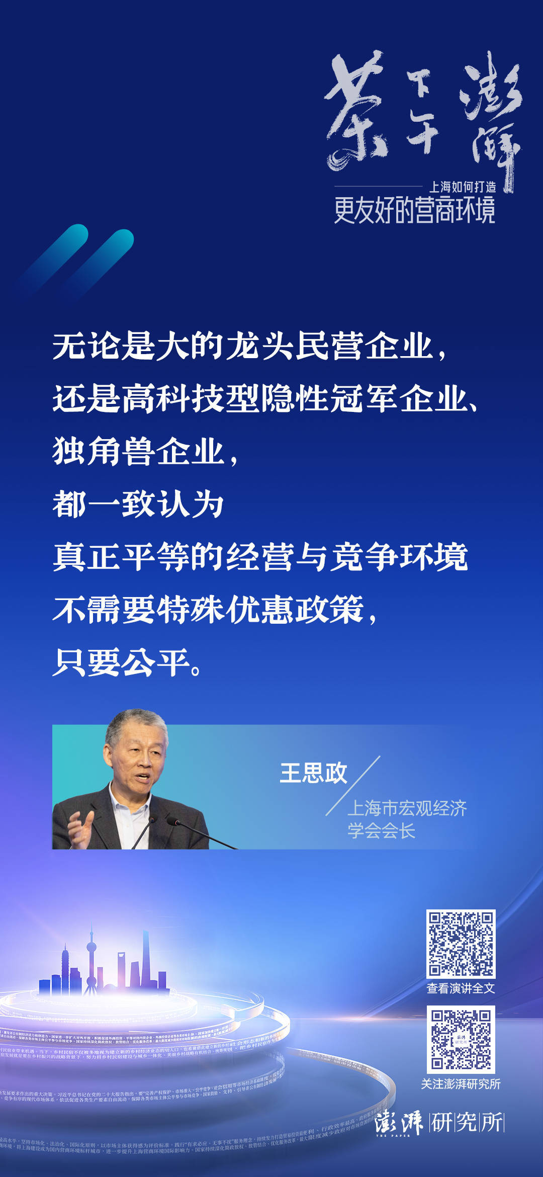 对于如何优化营商环境、促进经济发展,上海市宏观经济学会会长王思政分享了自己对于当下营商环境问题与解决思路的思考。围绕“市场化、法治化、国际化”,王思政提到过去上海发展中吸引外资、尊重契约的经验,以及上海支持民营经济27条等实践,并从政策、舆论等不同角度对为各类企业营造公平竞争的社会氛围、舆论环境提出了建议。