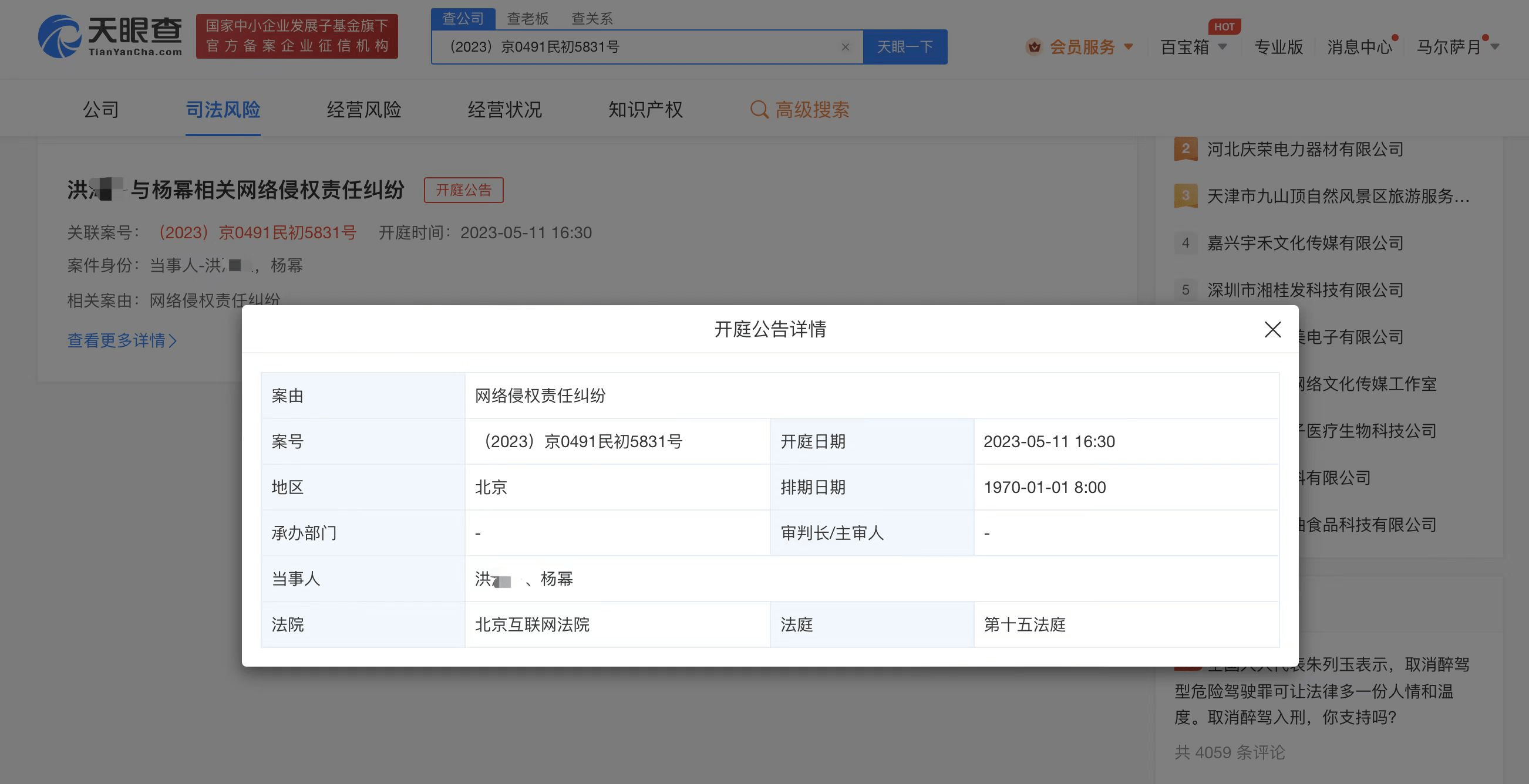 天眼查App显示,3月20日,北京互联网法院发布公告称,该院定于5月11日下午开庭审理杨幂与洪某某网络侵权责任纠纷一案。