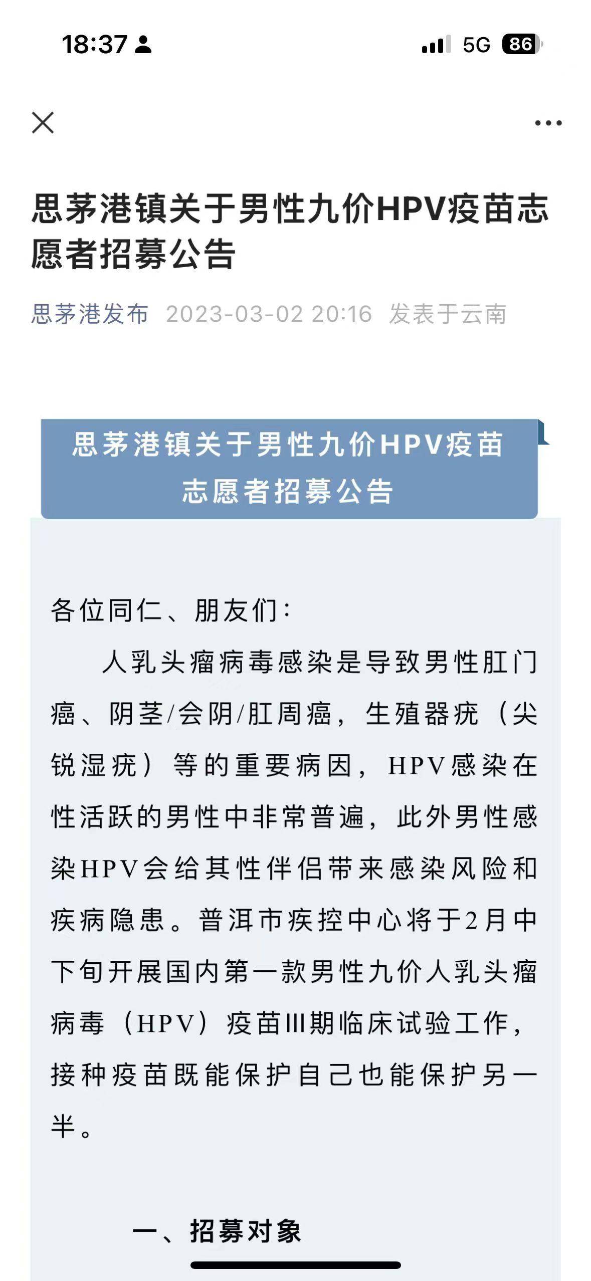 近日,一男子发布视频称自己在云南普洱免费接种了HPV疫苗,医生回应称这是重组HPV九价疫苗临床试验疫苗,报名成功者可免费接种。据悉,云南多地正在开展九价人乳头瘤病毒疫苗男性适应症III期临床研究工作,受试者通过问卷调查、体格检查等筛选后可免费接种九价HPV疫苗(男性适应症),受试者不限户口不限户籍,需要接种3针,全程不收取任何费用,参与还会有一定的补助。