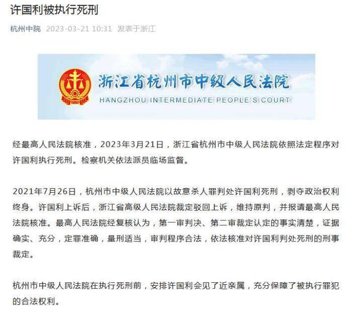 中新网3月21日电 据杭州市中级人民法院微信公众号消息,经最高人民法院核准,2023年3月21日,浙江省杭州市中级人民法院依照法定程序对许国利执行死刑。检察机关依法派员临场监督。