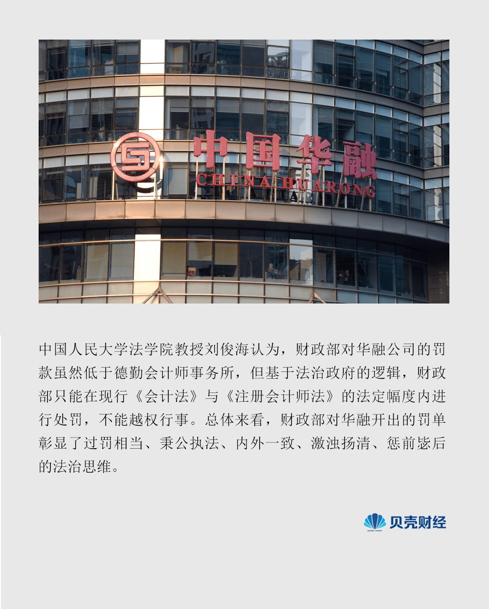中国人民大学法学院教授刘俊海认为,财政部对华融公司的罚款虽然低于德勤会计师事务所,但基于法治政府的逻辑,财政部只能在现行《会计法》与《注册会计师法》的法定幅度内进行处罚,不能越权行事。总体来看,财政部对华融开出的罚单彰显了过罚相当、秉公执法、内外一致、激浊扬清、惩前毖后的法治思维。