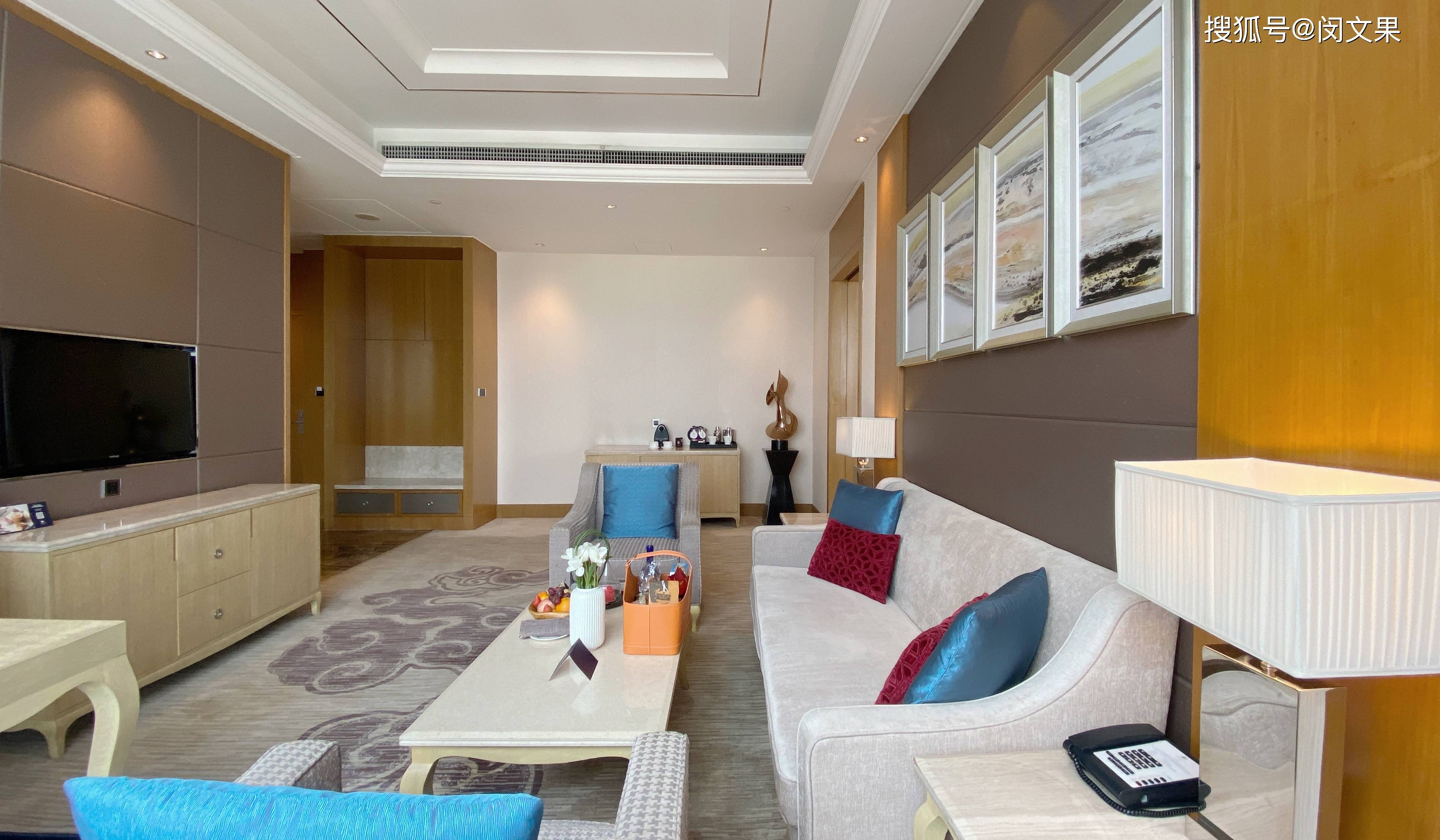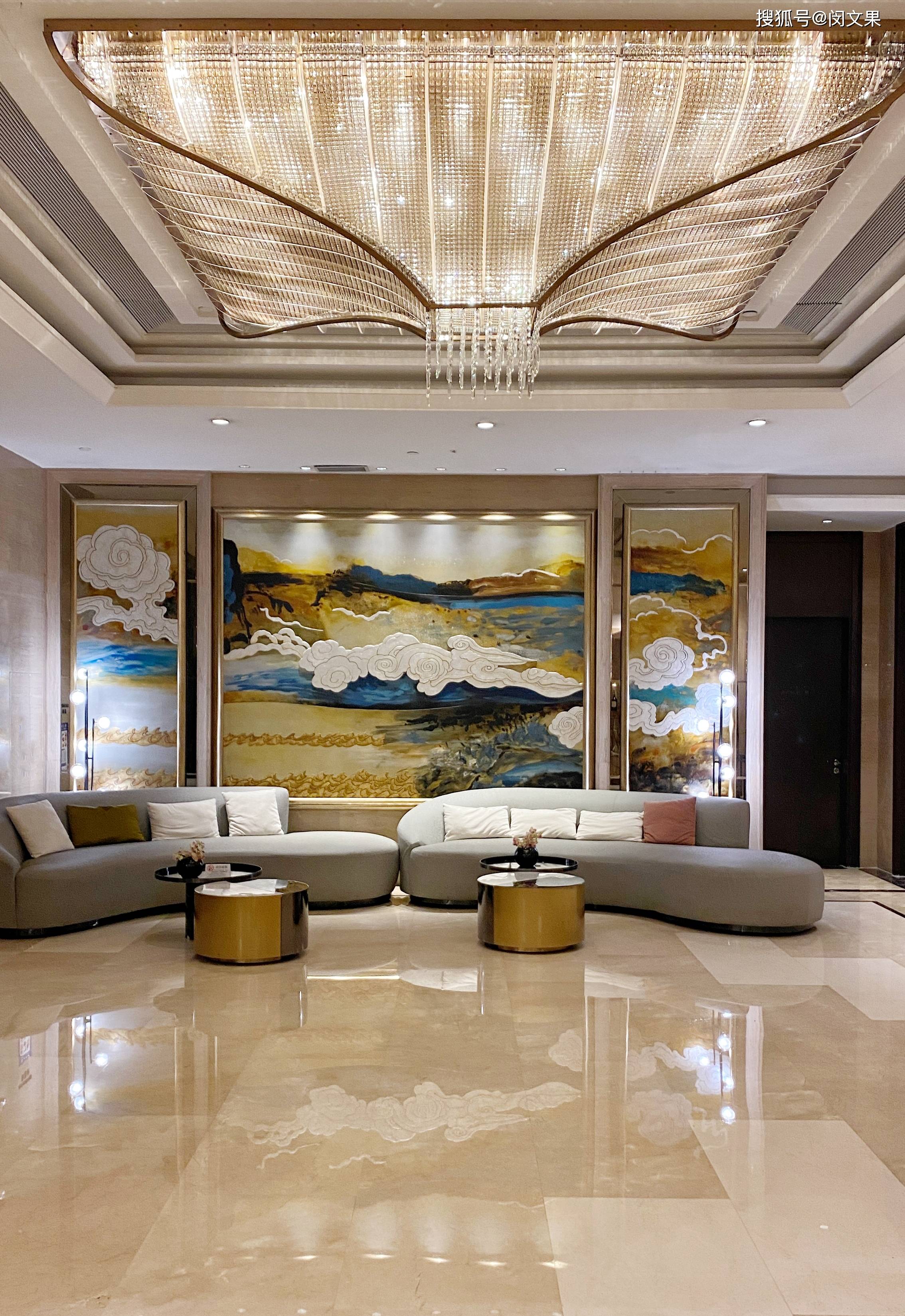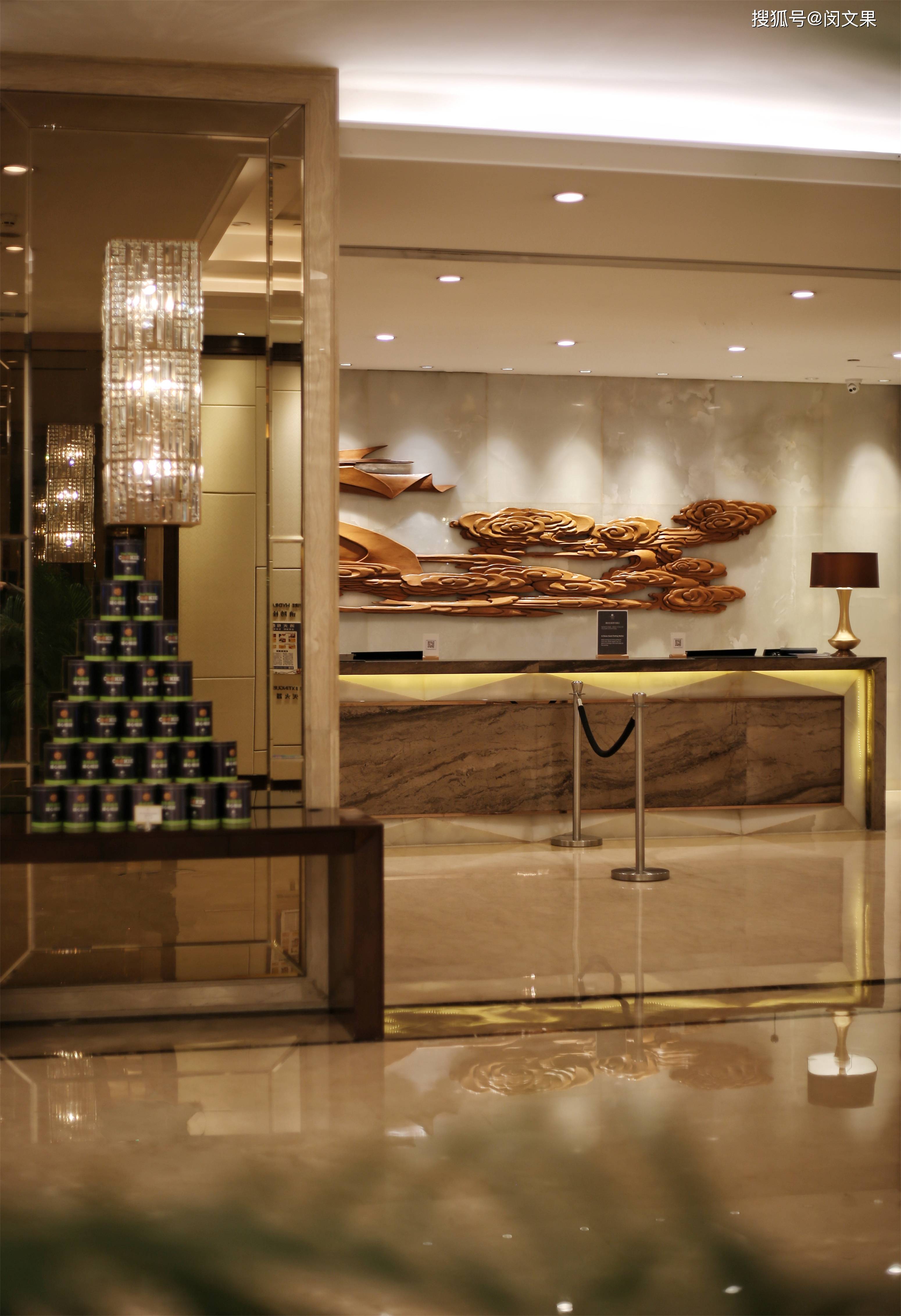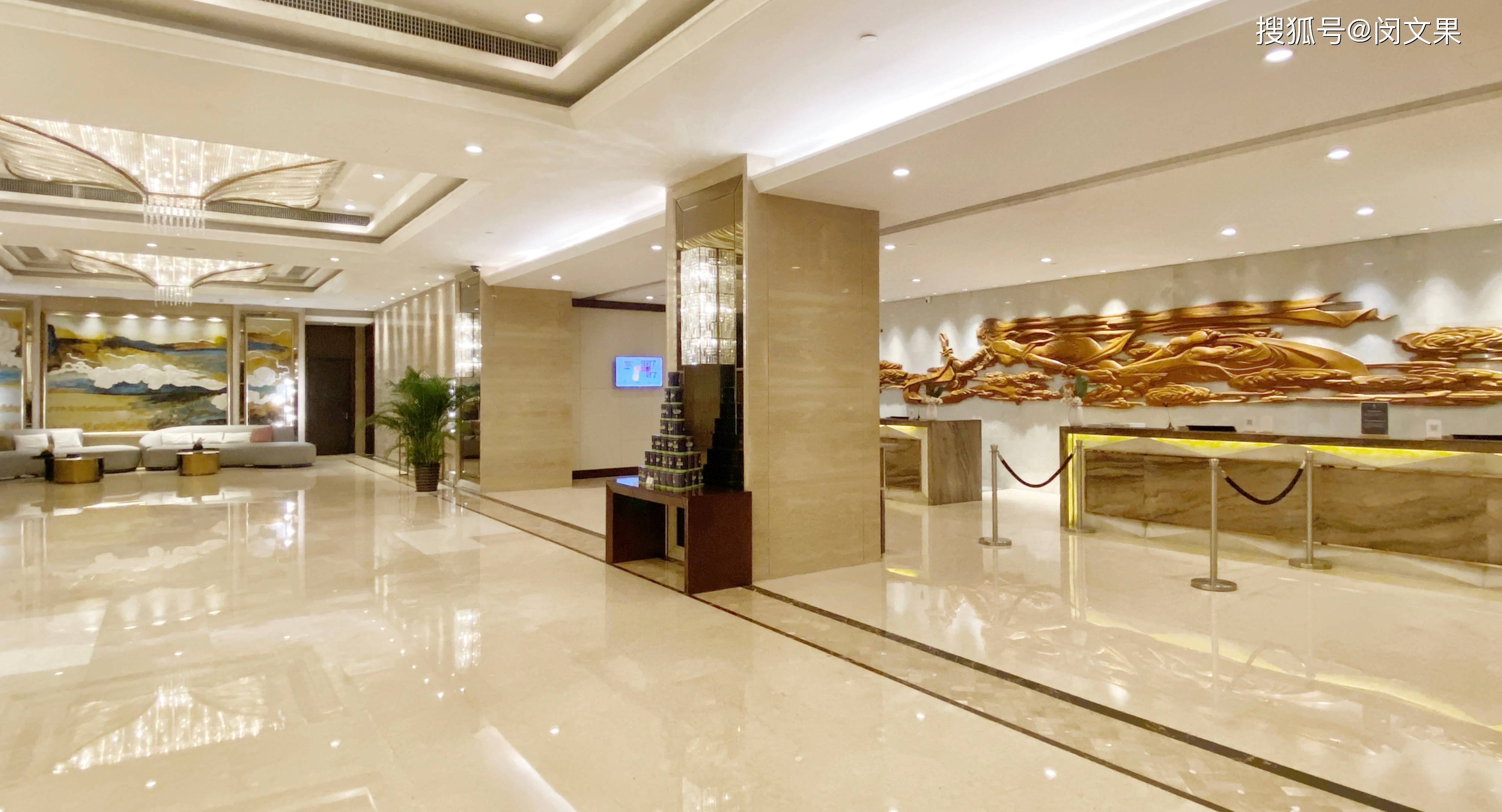 酒店整体设计风格以现代简约为主,融入部分岭南元素和周边文化特色。大堂装潢有简约东方美,水晶吊灯明亮空间,check in台背景墙的木雕壁画大气磅礴,空间氛围柔和又不失大气。
