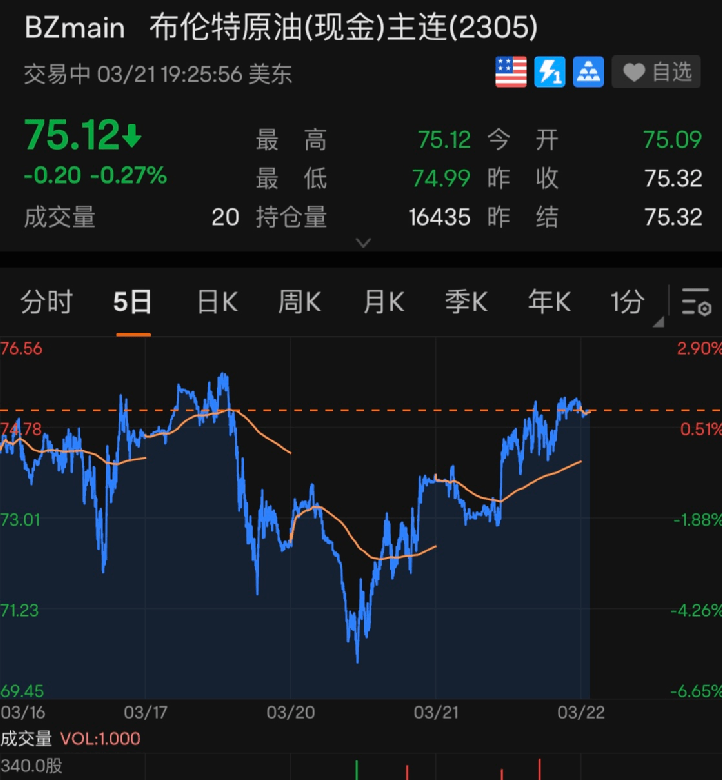 布伦特5月原油期货收涨1.53美元,涨幅2.07%,报75.32美元/桶,与WTI原油均收复上周三以来近半跌幅。目前位于75.12美元/桶附近。