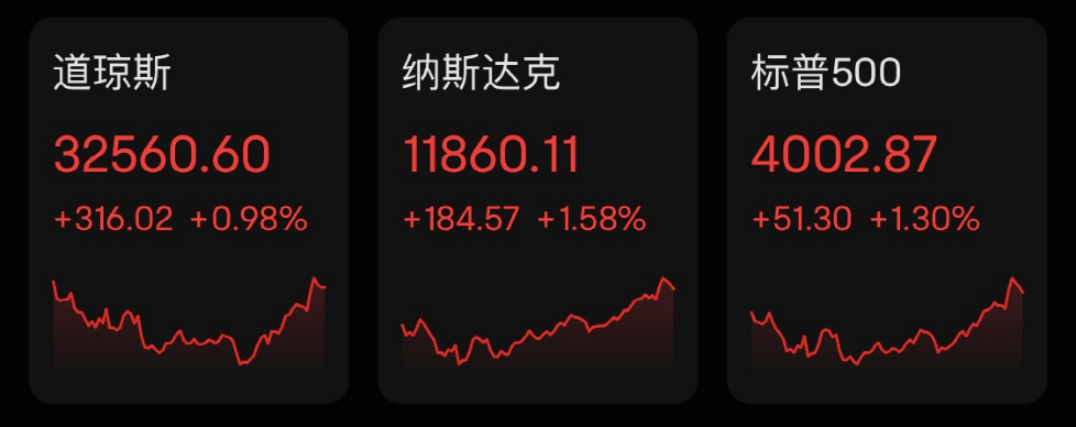 截至收盘,道指涨316.02点,涨幅为0.98%,报32560.60点;纳指涨184.57点,涨幅为1.58%,报11860.11点;标普500指数涨51.30点,涨幅为1.30%,报4002.87点。