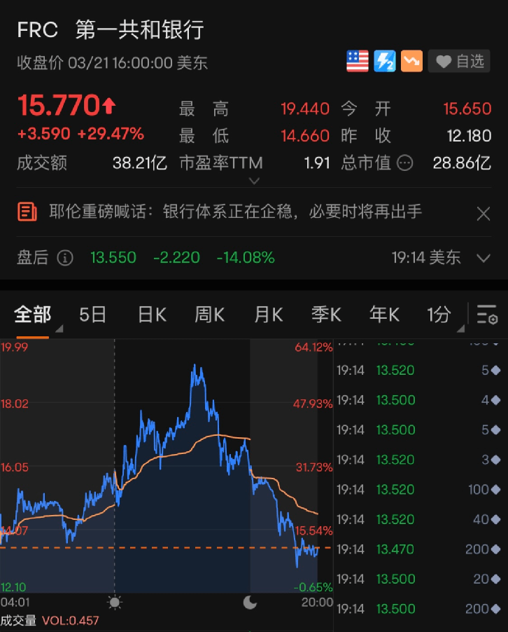 此消息一出,周二地区性银行股普遍上涨,第一共和银行盘中一度涨60%,最终收高近30%,但较3月3日的收盘价仍缩水超90%。该行称,如果增资失败,则考虑缩小自身规模。
