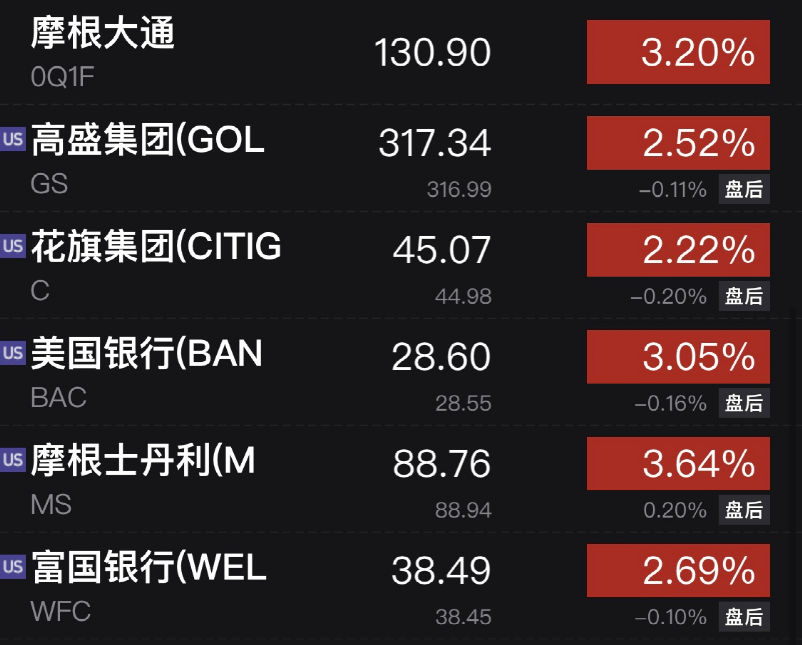 美国大型银行也全线上涨,摩根大通涨3.20%,高盛涨2.52%,花旗涨2.22%,摩根士丹利涨3.65%,美国银行涨3.05%,富国银行涨2.69%。