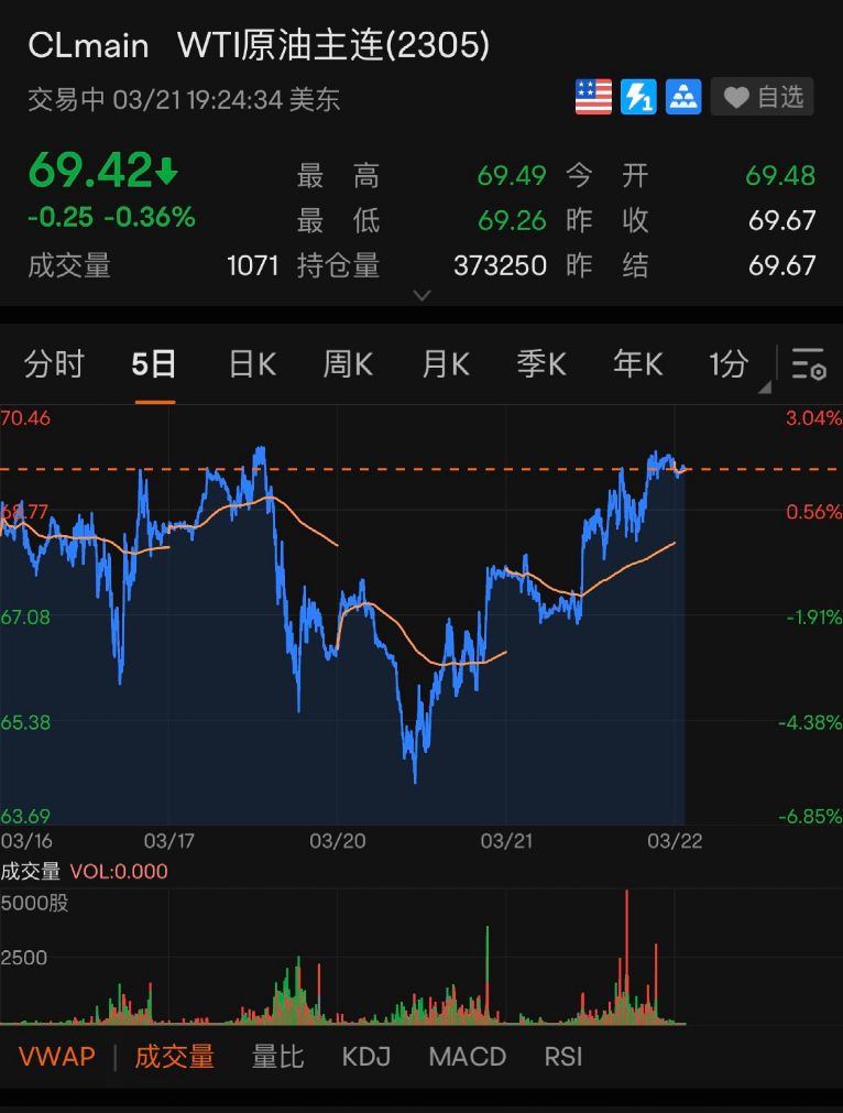 美国4月份交割的WTI原油期货价格较前一交易日收盘价上涨1.69美元,涨幅为2.5%,收于每桶69.33美元,为连续第二个交易日上涨。4月WTI期货在今日收盘时到期,5月WTI期货收高1.85美元,涨幅为2.7%,报收于每桶69.67美元,目前位于69.42美元/桶附近。