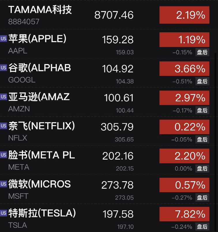 科技股全线上涨,万得美国TAMAMA科技指数涨2.19%,特斯拉涨7.82%,市值一夜上涨453亿美元(约合人民币3122亿元)谷歌涨3.66%。苹果涨1.19%,亚马逊涨2.97%,奈飞涨0.22%,脸书涨2.2%,微软涨0.57%。