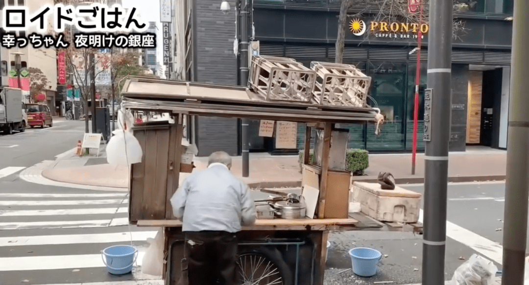 这位出没在银座附近的老人,用所有的积蓄打造了一辆手推车卖拉面,一天出摊两次。