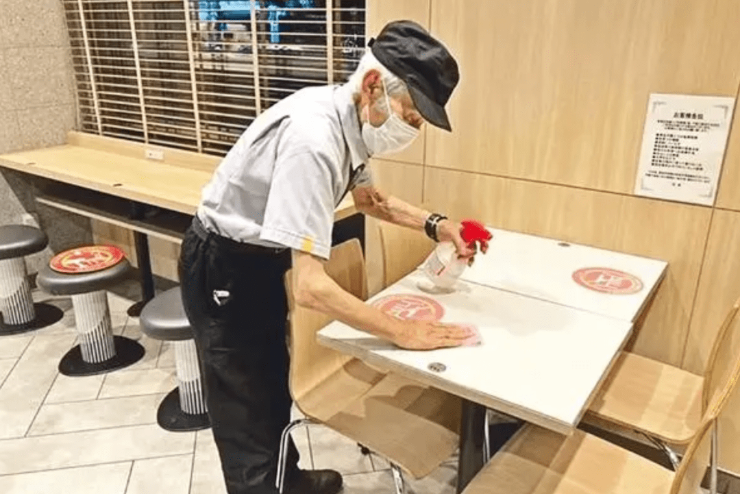 在日本一家麦当劳,一位93岁的老人麻利地擦着桌子。
