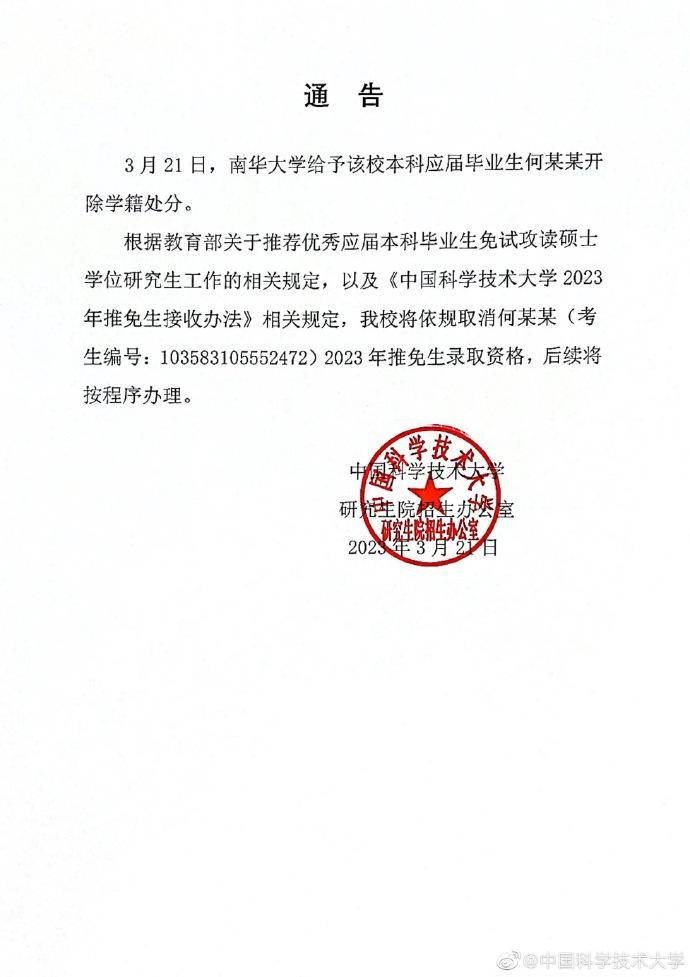 3月22日,中国科学技术大学 研究生院招生办公室发布关于取消何某某推免生录取资格的通告:3月21日,南华大学给予该校本科应届毕业生何某某开除学籍处分,根据相关规定,我校将依规取消何某某2023年推免生录取资格,后续将按程序办理。