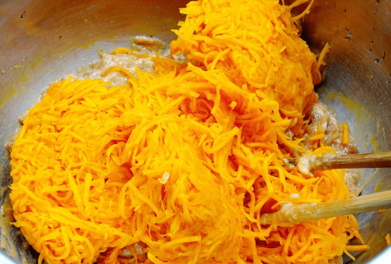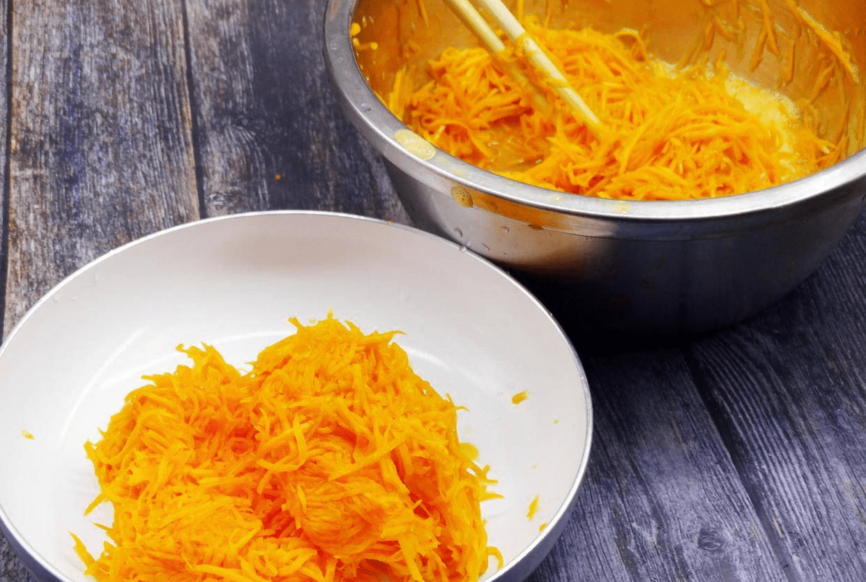 步骤二:等到南瓜丝出水,将南瓜丝攥干取出,南瓜汁留在盆中备用。