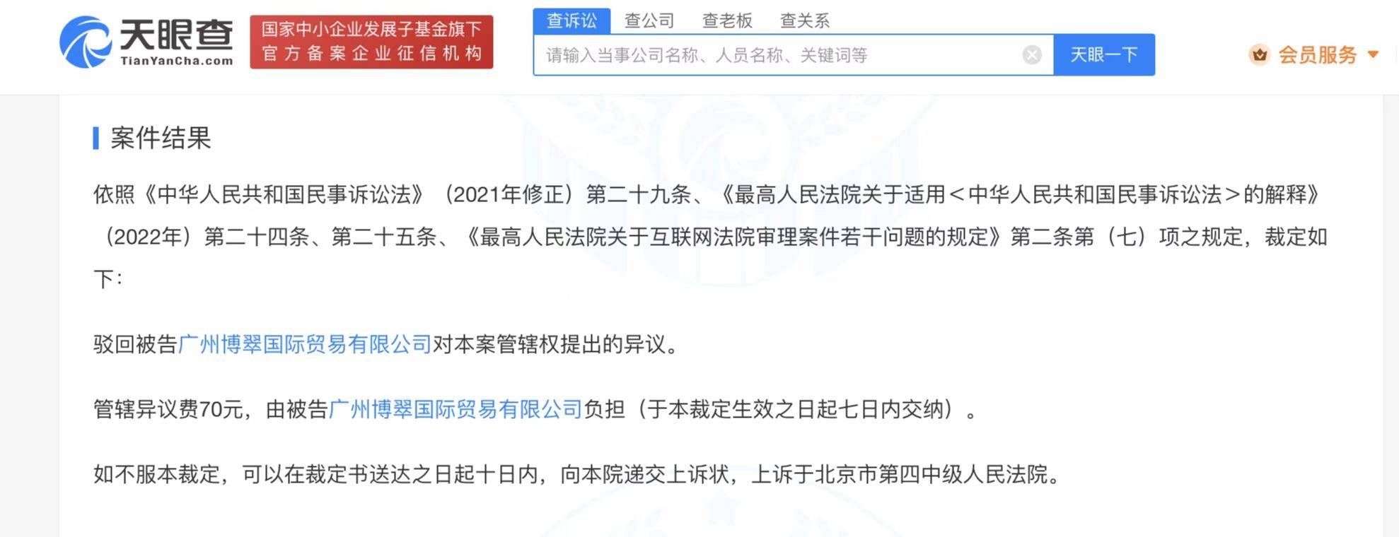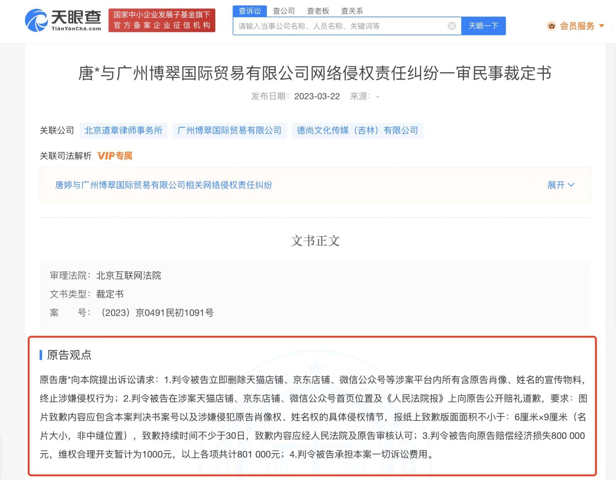 天眼查App显示,3月22日,唐婷(唐艺昕)与广州博翠国际贸易有限公司网络侵权责任纠纷一审裁定书公开。